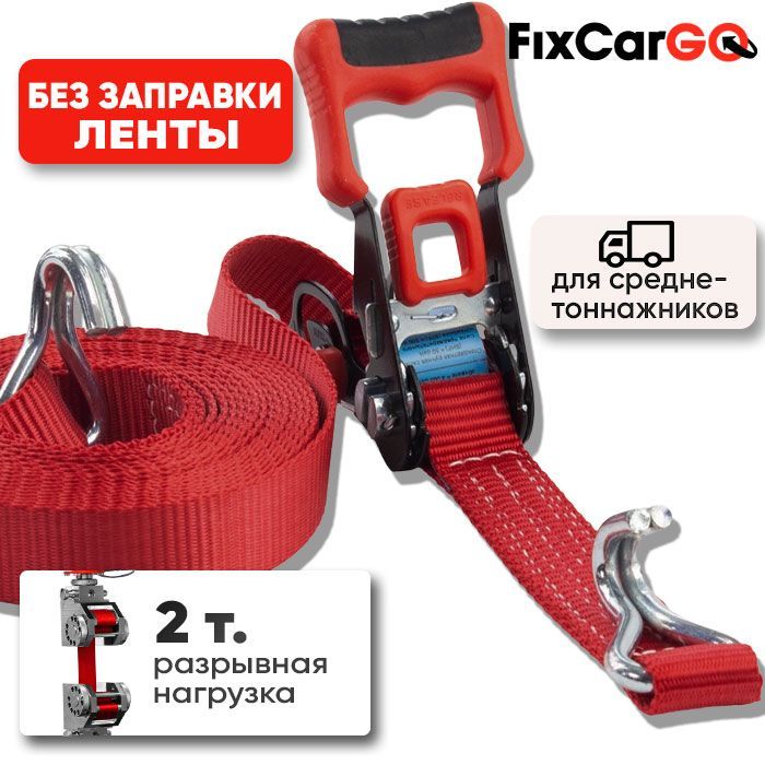 Этот состоит из одной части, ленту не нужно продевать в проём осей натяжного механизма, это цельная полиэстеровая лента с двумя крюками на концах. Крюки крепятся к точкам крепления груза, расположенным в кузове транспортного средства.